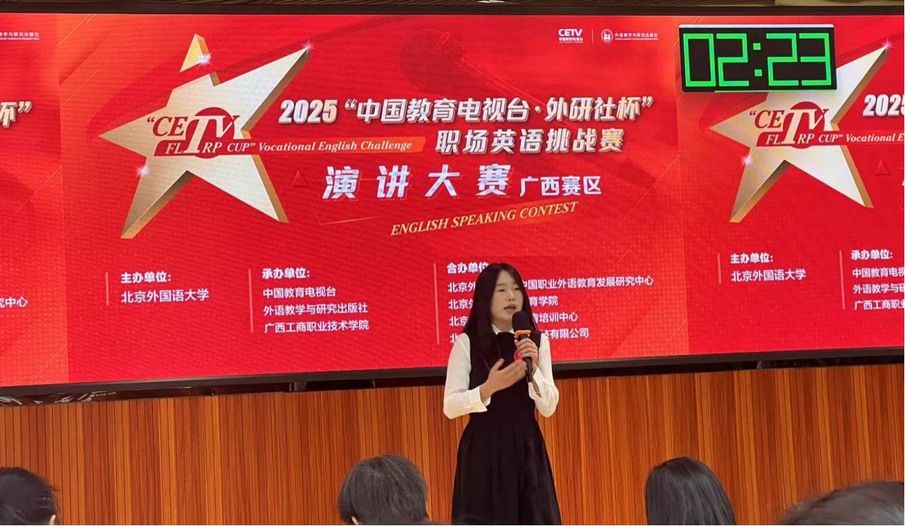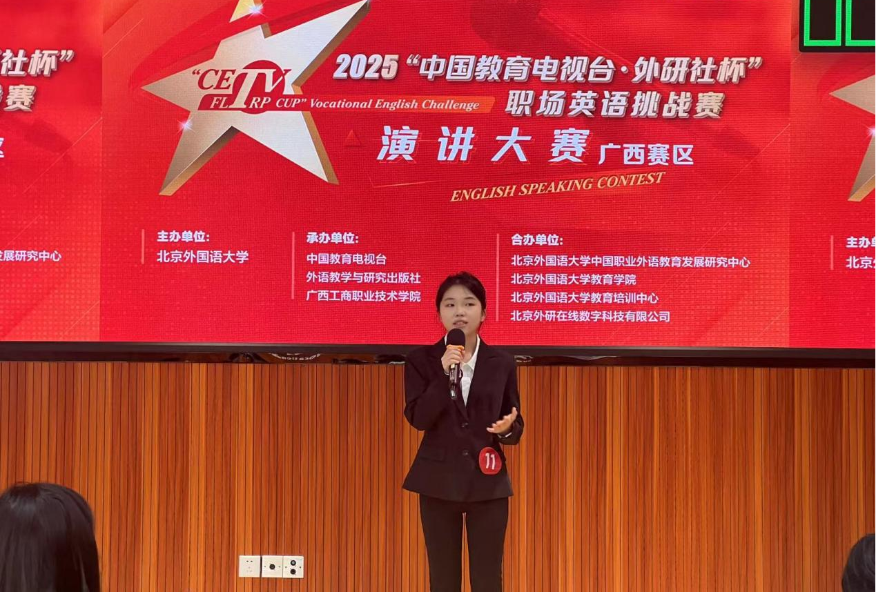 2025年11月1日,2025年外研社杯·职场英语挑战赛(演讲大赛)广西赛区在广西工商职业技术学院(鹏飞校区)举行,来自广西26所高校的47名顶尖选手齐聚赛场、闪耀舞台。