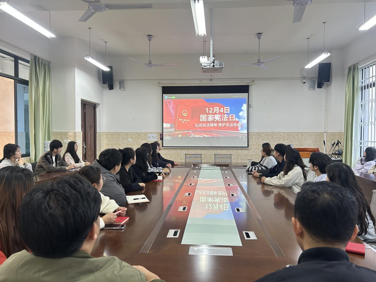 为深入学习宣传宪法,弘扬宪法精神,增强全体辅导员的法治素养和履职能力,2025年12月4日,广西外国语学院高等职业学院组织全体辅导员在大成楼101会议室集中收看宪法晨读网络直播活动,引导辅导员以法治思维赋能学生管理工作,切实筑牢校园法治教育根基。