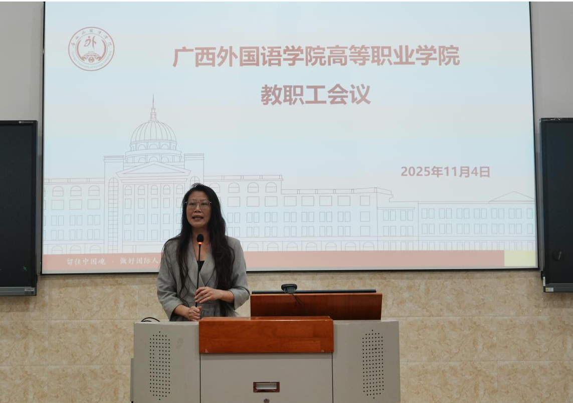 2025年11月4日,高等职业学院在大成楼107教室召开全体教职工会议,会议由高等职业学院常务副院长覃丽主持,全体教职工参会。