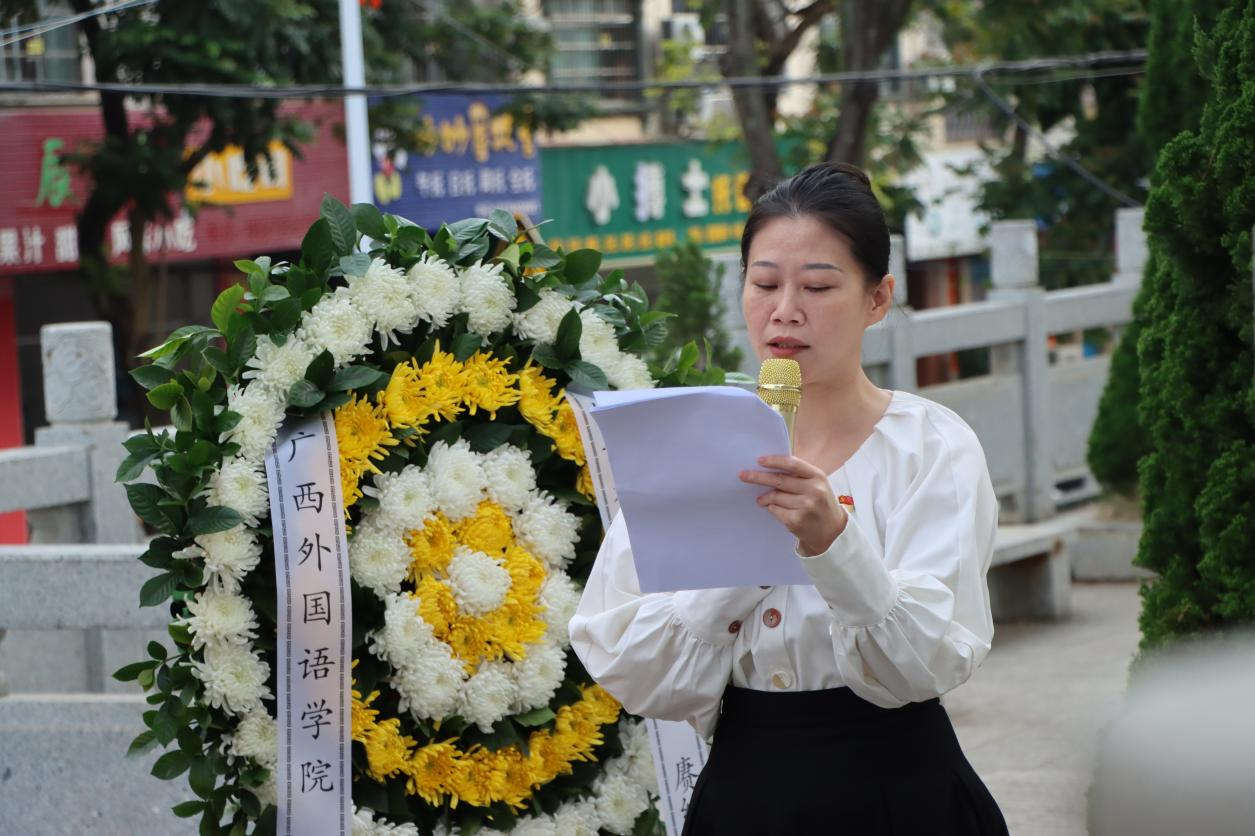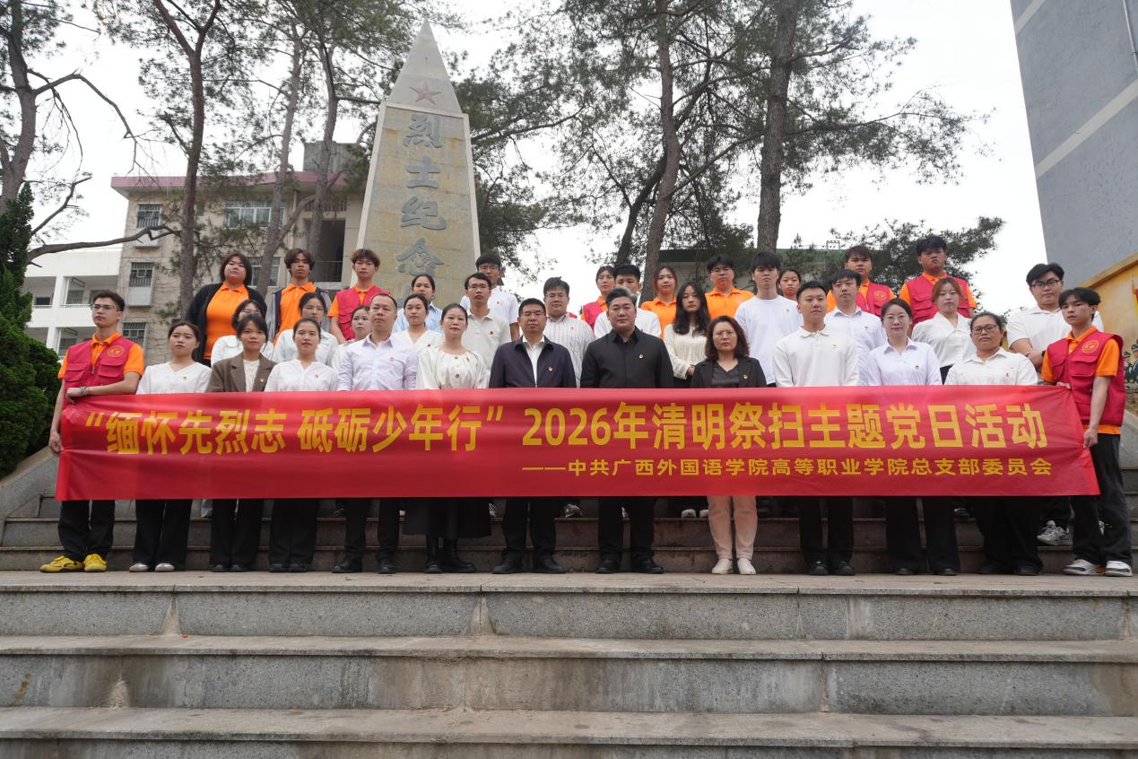 为深切缅怀革命先烈,传承红色基因,厚植爱国主义情怀,引导广大师生铭记历史、致敬英雄,2026年3月23日上午,广西外国语学院高等职业学院组织45名师生代表前往扶绥县烈士纪念塔,开展“缅怀先烈志,砥砺青年行”清明节祭扫活动。广西外国语学院党委副书记钟志锋同志、广西外国语学院副校长马剑平博士、学校行政部门代表以及师生代表参加此次活动,活动由学校纪委委员、高等职业学院党总支书记、院长覃丽主持。