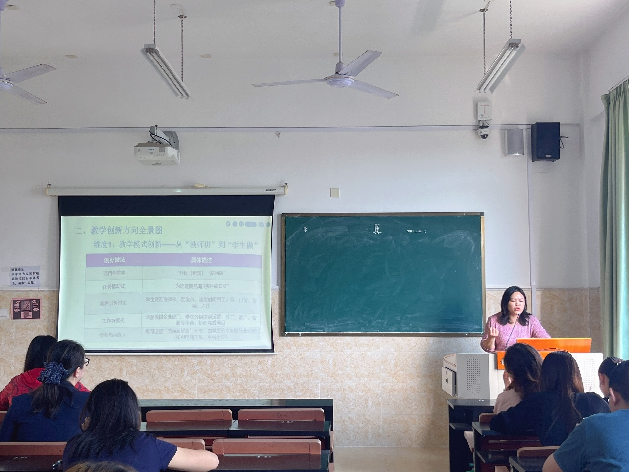 议程第四项,系副主任覃梦华老师围绕《电子商务》课程教学创新作分享。她立足会计专业数字化发展趋势,从会计岗位面临的业态变革出发,引导学生清晰认识电子商务对会计工作场景的深刻影响,帮助学生理解会计专业学习电子商务课程的必要性与现实意义,进一步拓宽专业视野,增强对数字经济时代会计职业发展的适应能力。她探索跨领域课程教学创新模式,助力学生适应数字经济时代会计岗位新需求,同时鼓励教师积极运用 AI 技术、多媒体工具提升课堂互动性与教学效率。