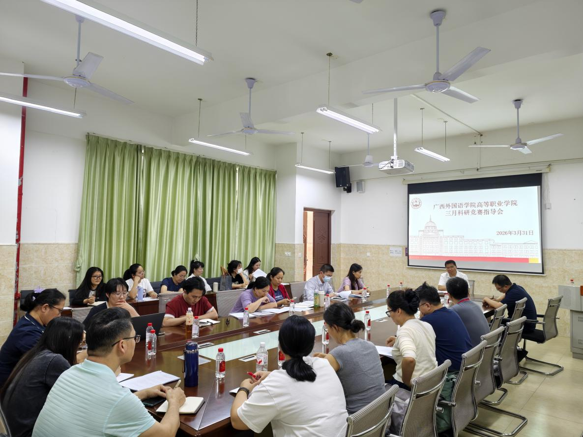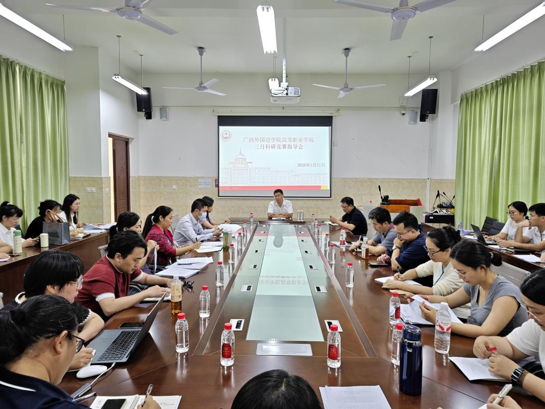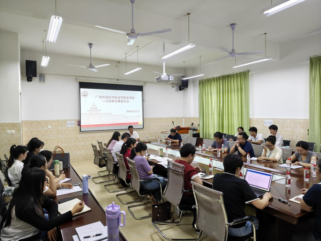 为推进学院高质量发展,深化产教融合与创新创业教育改革,广西外国语学院高等职业学院于2026年3月31日下午,在大成楼101会议室召开三月科研竞赛指导会。此次会议由高等职业学院副院长曾迅主持,广西外国语学院副校长马剑平博士专程到会指导,与学院系主任、副主任及骨干教师代表座谈交流。