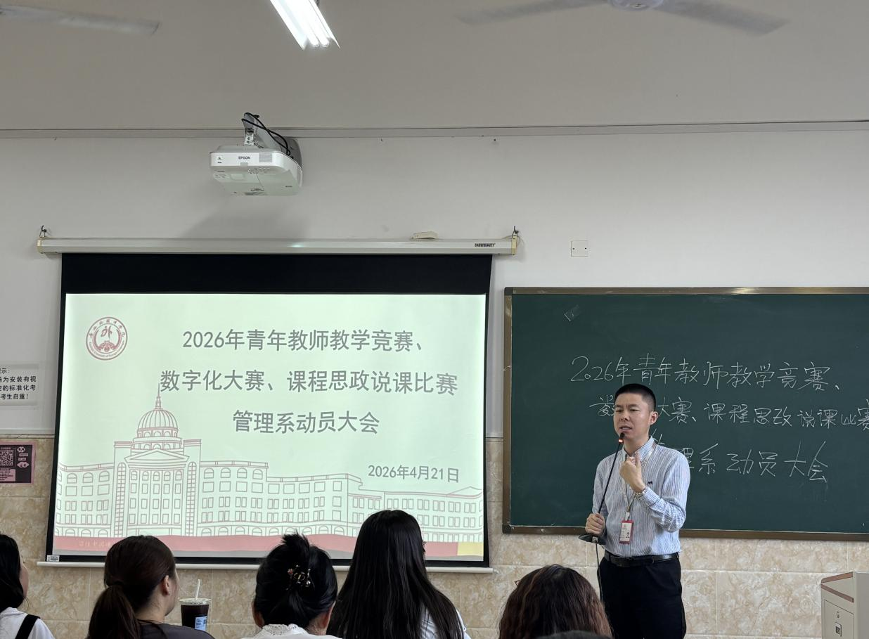 4月21日下午,高等职业学院管理系在空港校区大成楼105教室召开2026年三项教学比赛动员大会,会议就广西外国语学院第二届课程思政教学比赛、2026年教育教学数字化大赛及2026年青年教师教学竞赛进行统一部署与动员,管理系教师们统一思想、有序推进。会上分别介绍了三项比赛的基本情况、解读了竞赛规则,并提出了团队建设及赛前准备建议。管理系全体教师参会,会议由管理系副主任李阳主持。