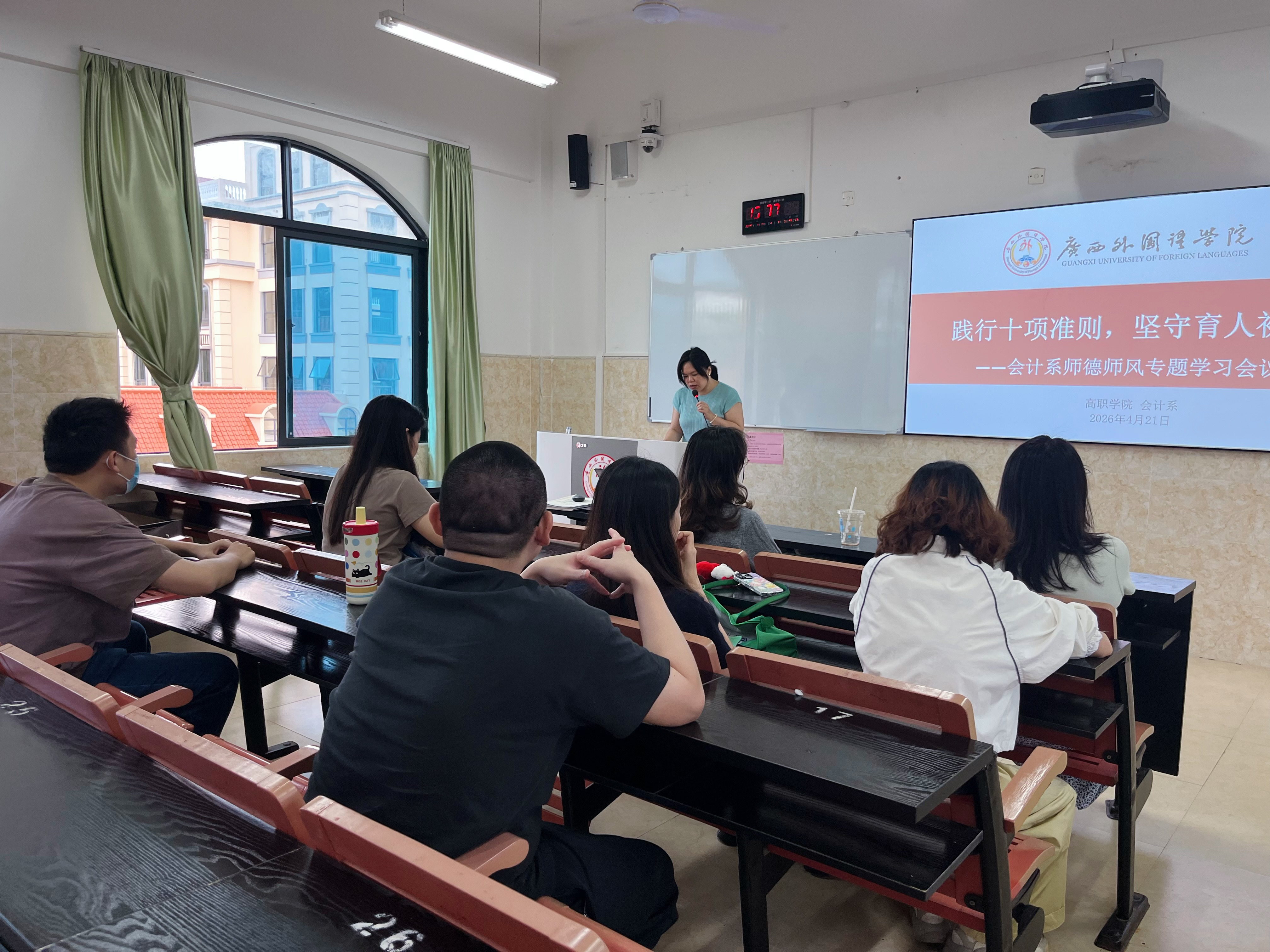 随后,会计系副主任覃梦华老师对此次会议精神作了进一步强调,要求全系教师对照准则查找不足,持续提升职业道德修养和教育教学水平,不断营造风清气正、崇德尚教的良好氛围。会计系将以此次会议为契机,持续推进师德师风建设常态化、长效化,不断提升教师队伍思想政治素质和职业道德水平。