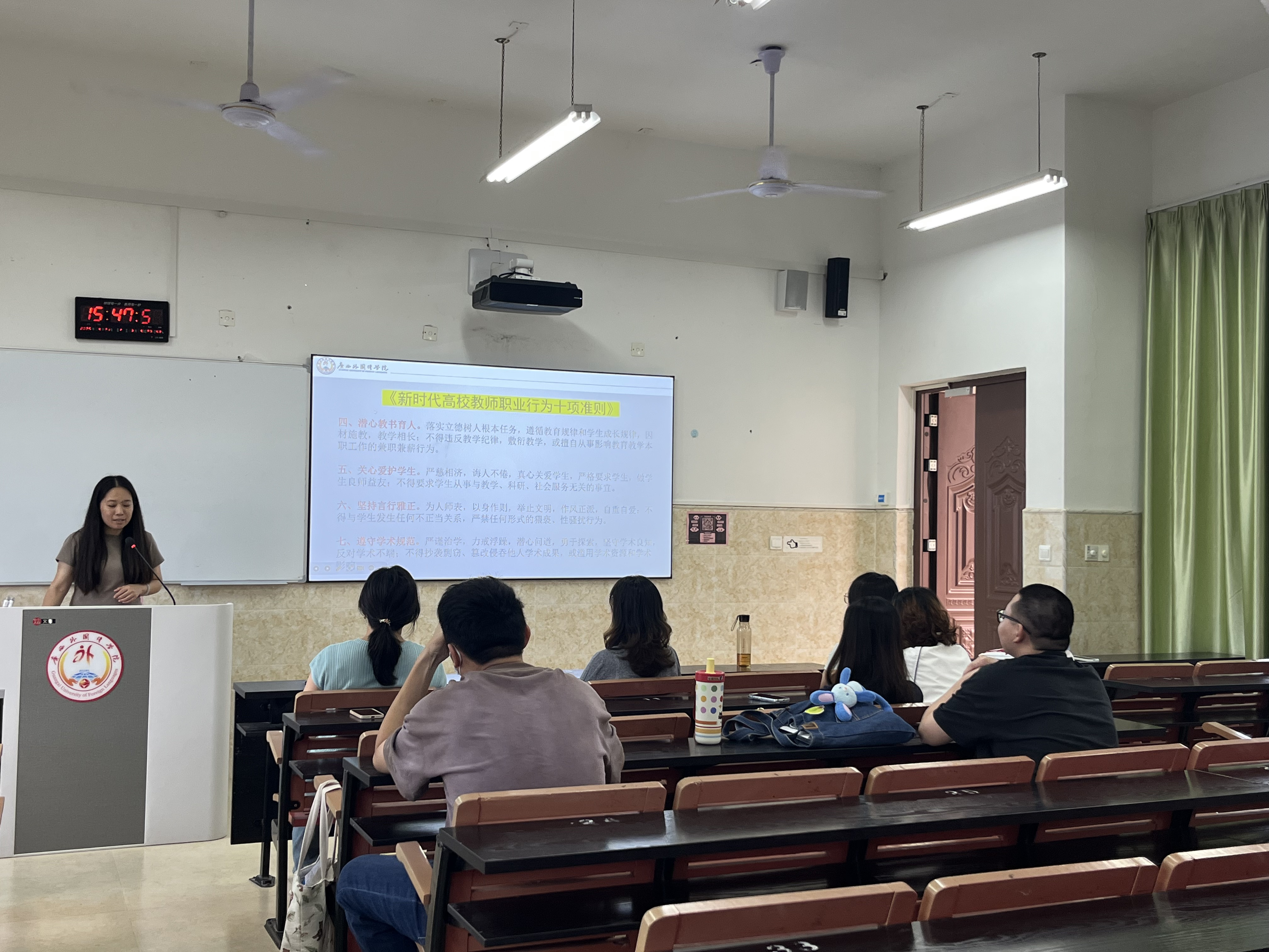 在警示教育环节,覃梦华老师结合近年来高校师德失范典型案例和工作中容易忽视的风险点开展专题分享,围绕师生关系边界、教学管理纪律、学术规范、廉洁自律、信息安全等方面进行深入剖析。会议强调,全体教师要始终做到警钟长鸣,切实增强规则意识和底线意识,坚决守住“不收受学生及家长礼品礼金、不在成绩评定中徇私、不敷衍教学、不擅自调停课”等纪律红线,把师德要求贯穿教育教学全过程。