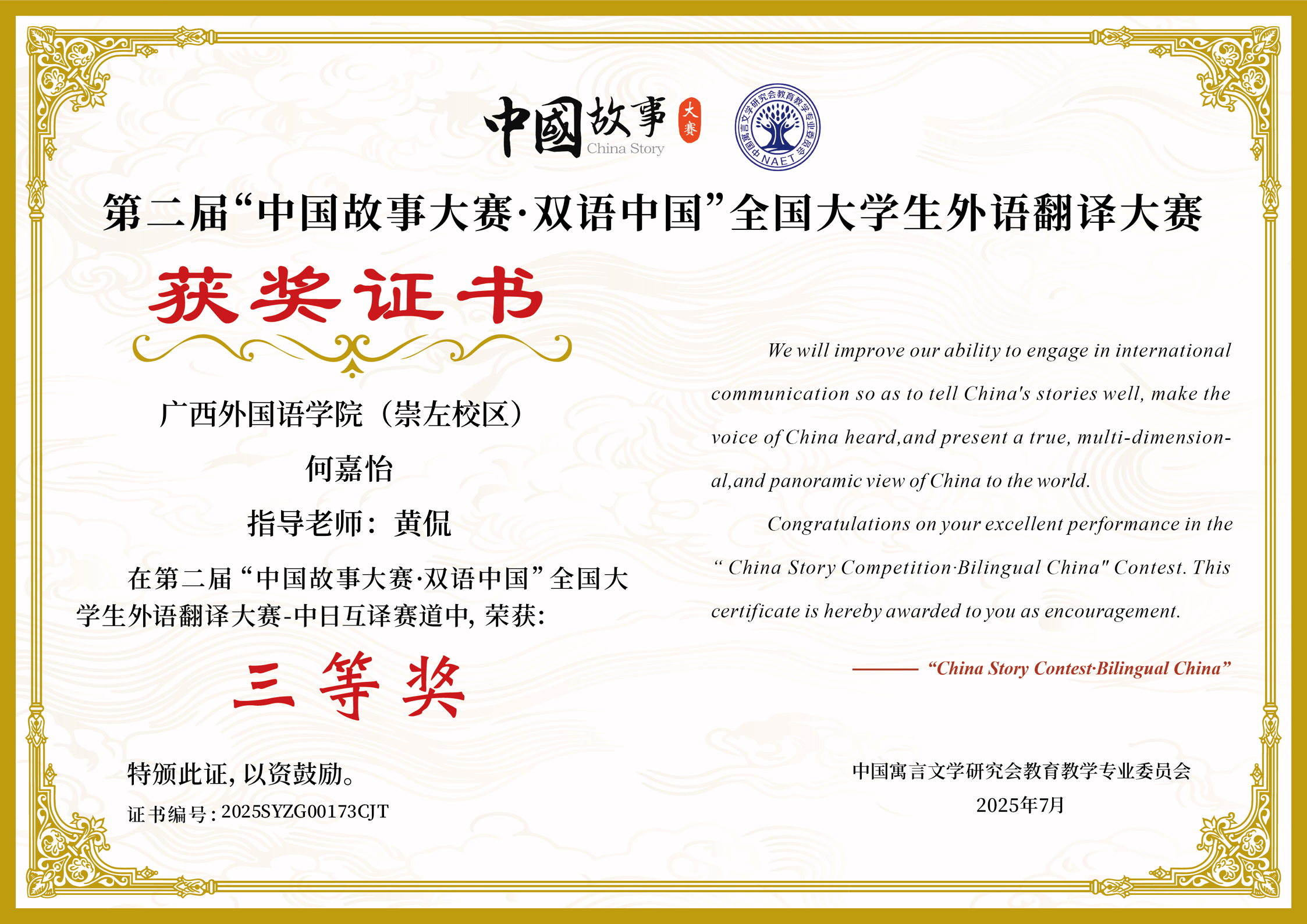 全国性学科竞赛获奖证书